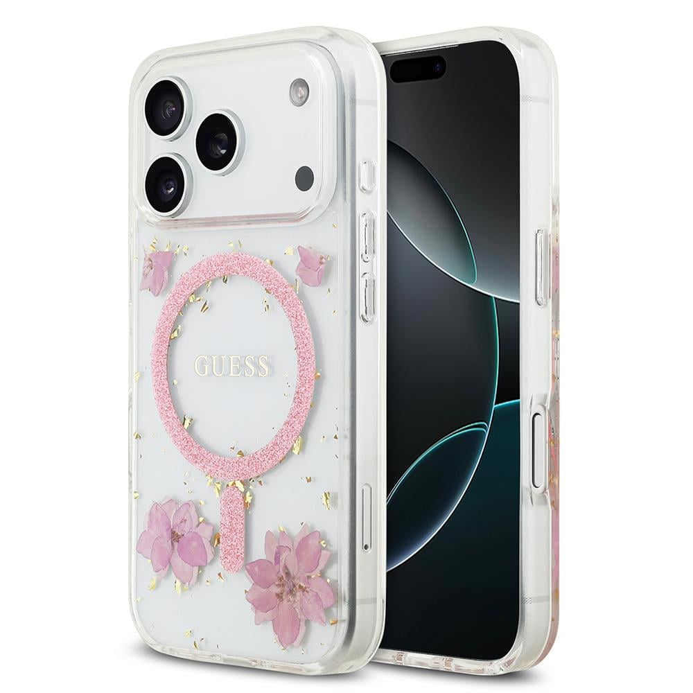 Apple iPhone 17 Pro Kılıf Guess Orjinal Lisanslı M-safe Şarj Özellikli Transparan Resin Flowers Kapak (TA126809)